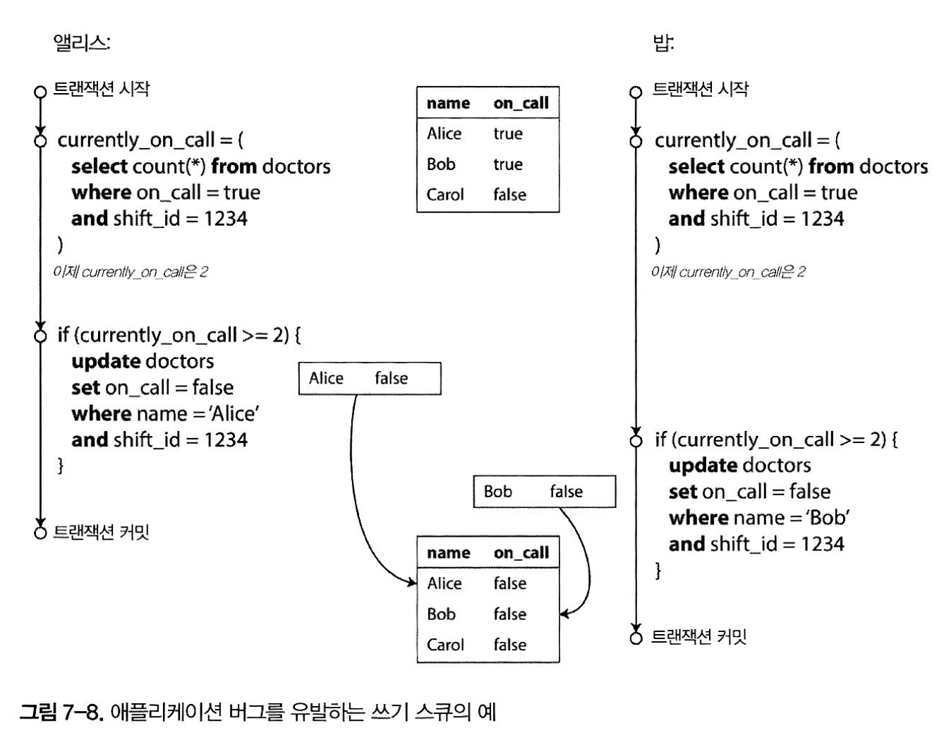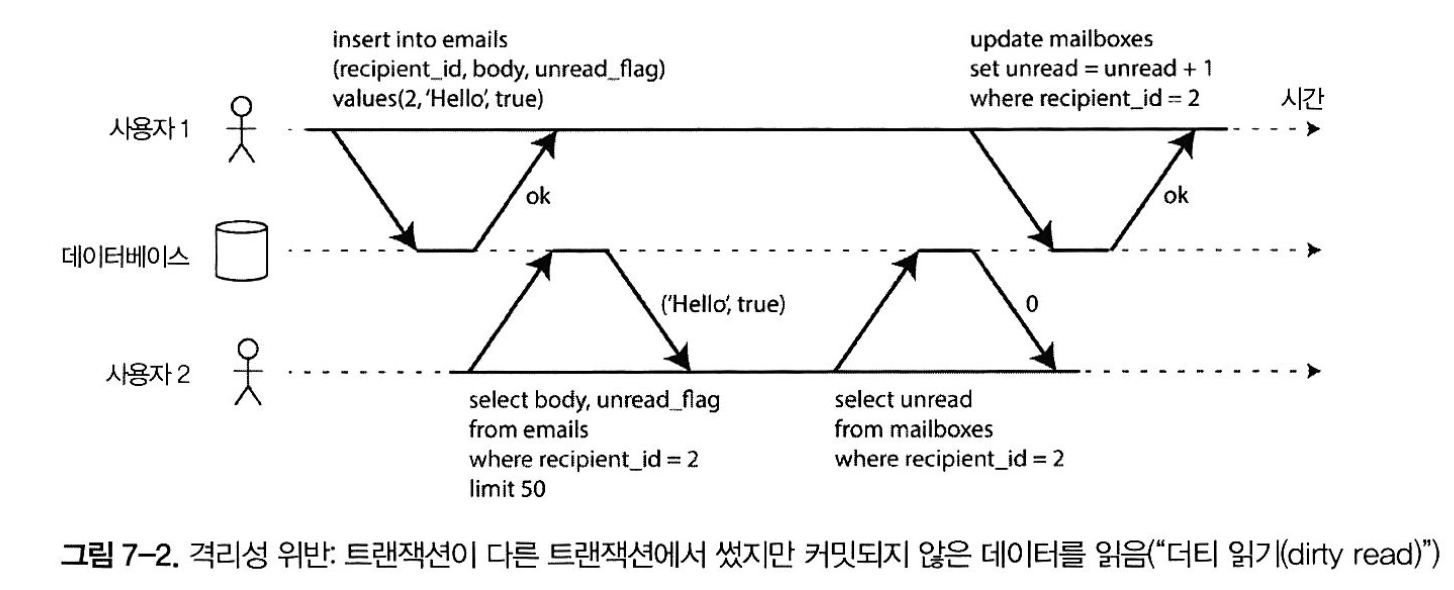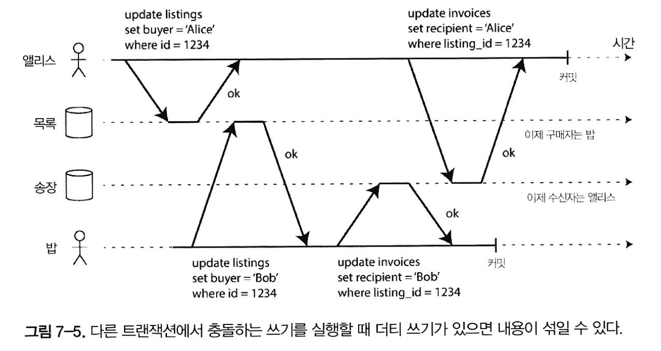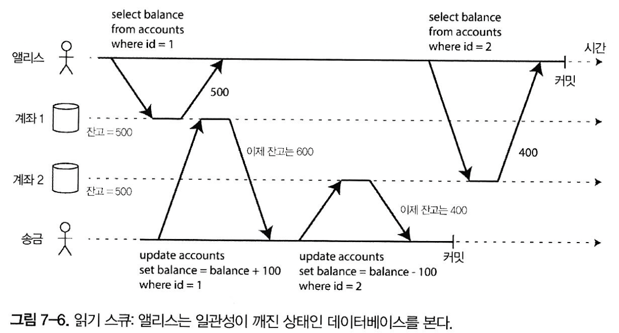 - 읽기 스큐 - 클라이언트는 다른 시점에 데이터베이스의 다른 부분을 본다. 스냅숏 격리로 해결(MVCC를 써서 구현)
