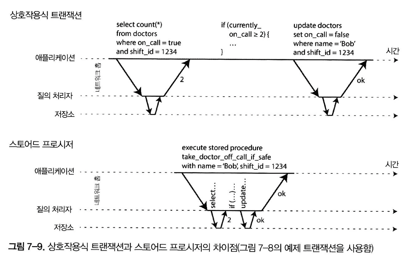 ! 대신에 트랜잭션 코드 전체를 스토어드 프로시저 형태로 데이터베이스에 미리 제출함.