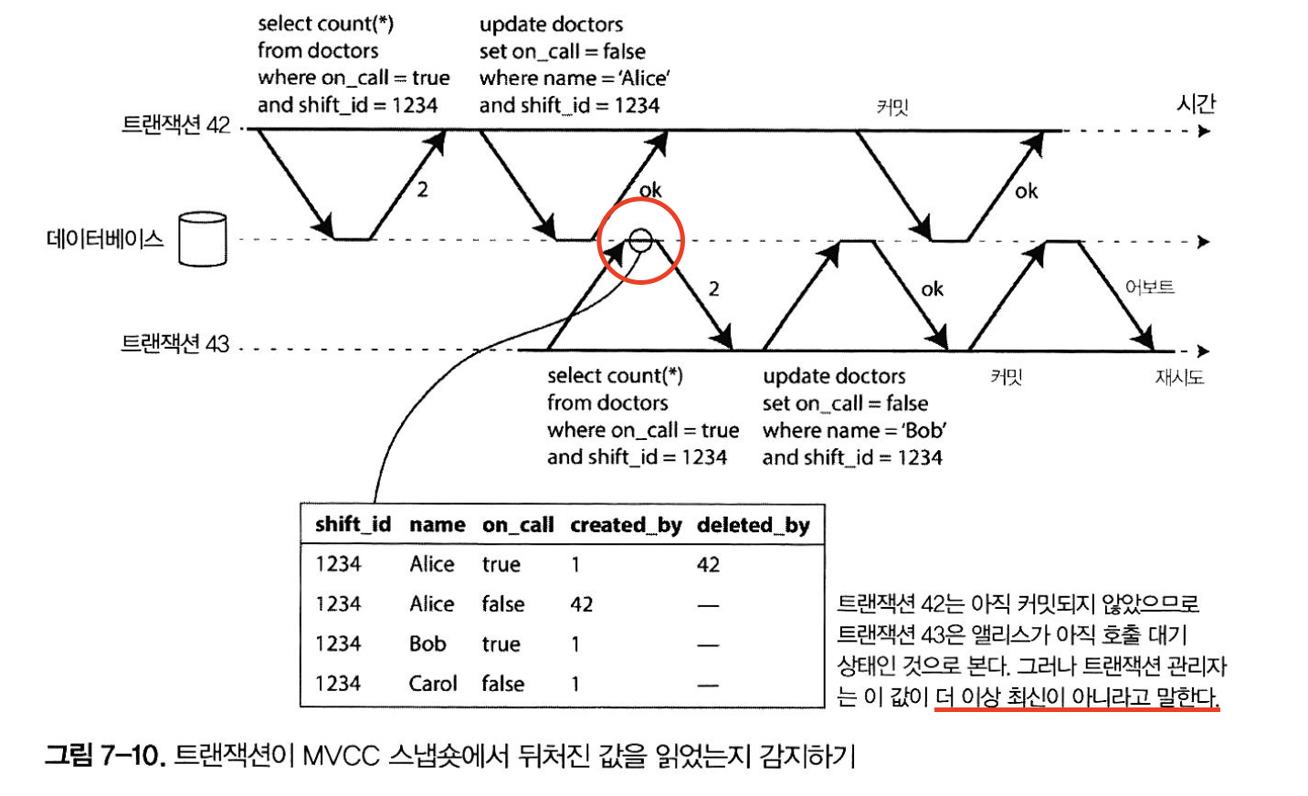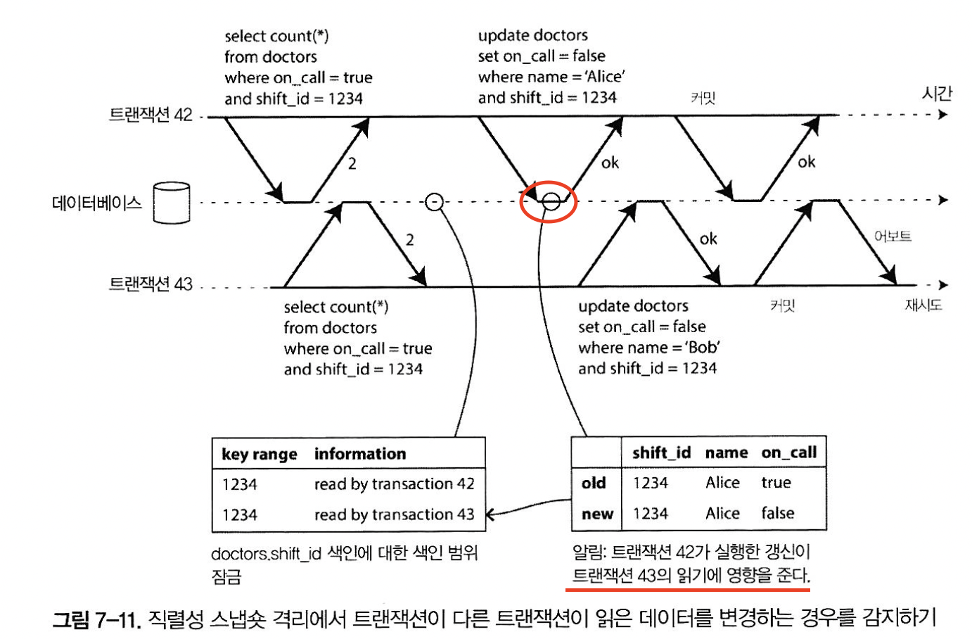 트랜잭션42가 먼저 커밋을 시도해 성공하고 트랜잭션 43이 실행한 쓰기는 트랜잭션 42에 영향을 주지만 아직 트랜잭션43이 커밋되지 않았으므로 그 쓰기 효과는 없다. 그러나 트랜잭션 43이 원할때 충돌되는 쓰기가 이미 있으므로 트랜잭션 43은 어보트돼야 한다.