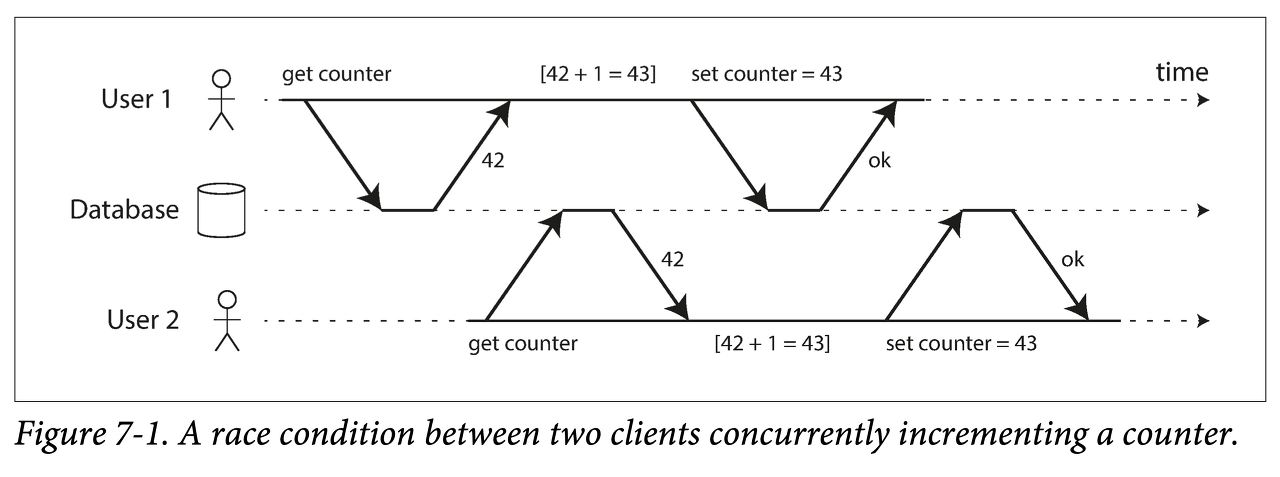 갱신 손실: 카운터 증가(read-modify-write_와 같이 여러 쓰기가 동시에 수행되는 경우, 시점에 따라 일부 변경사항이 손실될 수 있다.