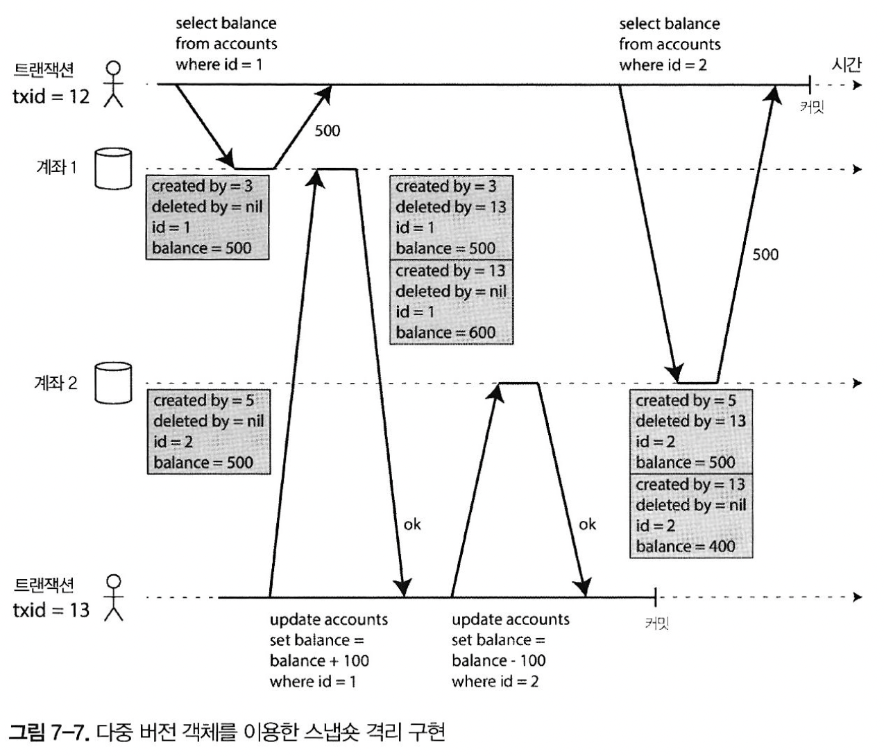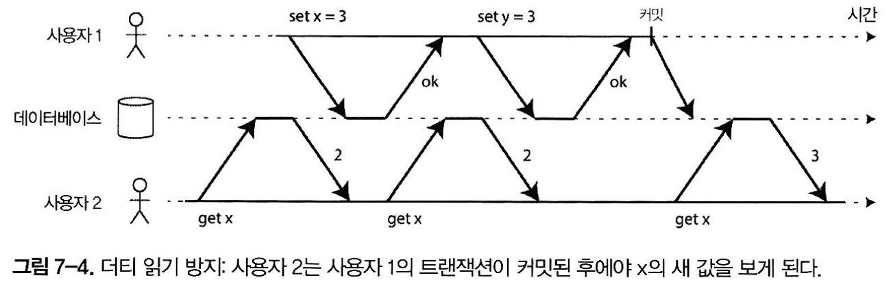 그림 7-4의 방법을 통한 더티 읽기를 방지하여 해당 트랜잭션이 실행 중인 동안 그 객체를 읽는 다른 트랜잭션들은 과거의 값을 읽게 된다. 새 값이 커밋되어야만 다른 트랜잭션들이 새 값을 읽을 수 있다.