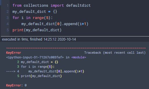 만약 아래와 같이 defaultdict가 아닌 일반 dictionary 형으로 위와 같이 접근하려면