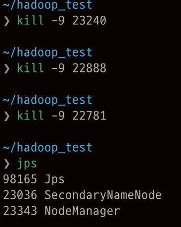 데이터노즈, 네임노드, 리소스 매니저 등등 잘 돌고 있었고 이제 테스트가 끝나서 종료하려고 ./stop-all.sh 명령어를 넣었는데 java virtual machine에서는 종료가 안된건지 자꾸 남아서 직접 Kill 해 주어야 했다.